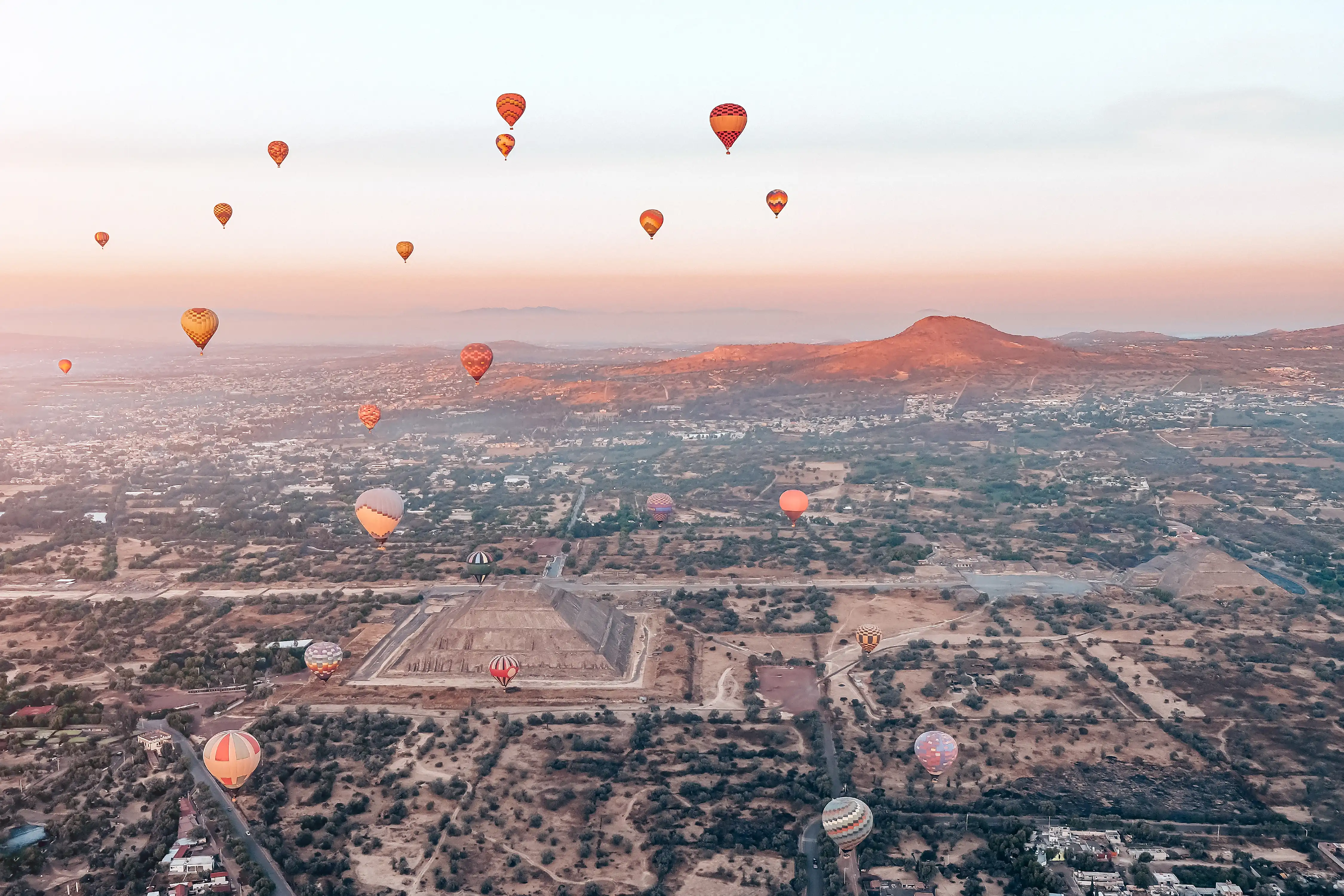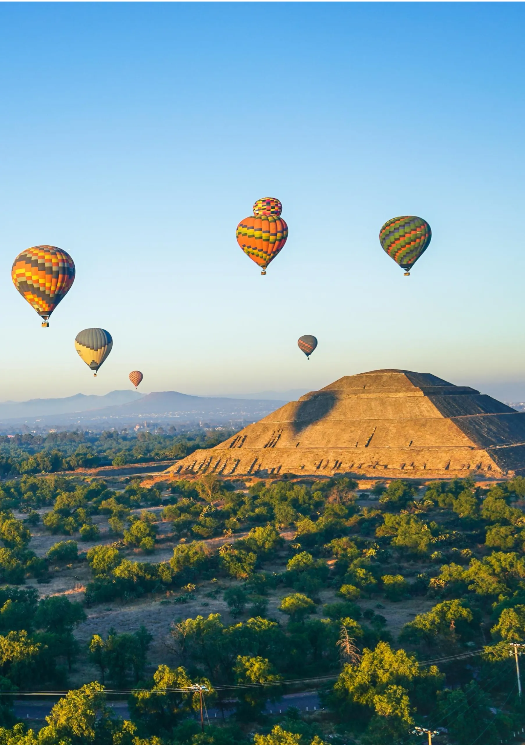 - Vuelo en globo aerostático 30–50 min (aprox. 45 min) hasta 10,000 ft sobre Teotihuacán.